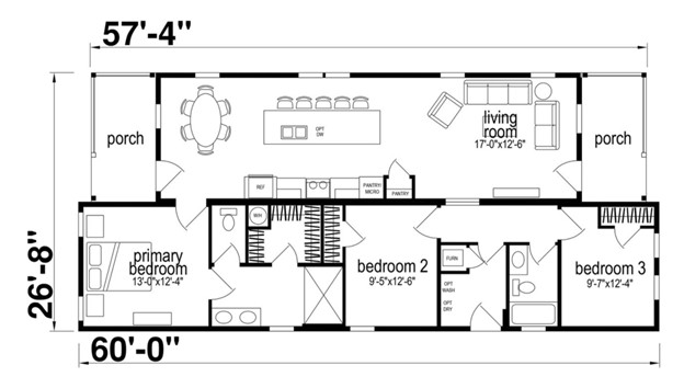 The Genesis built by Champion Homes / Skyline features 3 bedrooms, 2 bathrooms, and 1,386 sq. ft. of living space. Its open floor plan includes a large living room, kitchen, and dining area, ideal for entertaining. The master suite boasts a private bath and generous closet space. Designed with energy efficiency in mind, this is a modern, stylish home for relaxed living in a 60' x 26' 8" footprint.